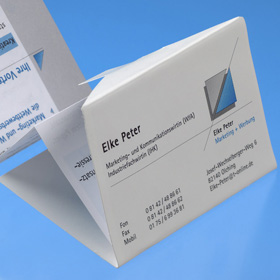 passt in jede Geldbörse. Und doch ist diese Visiten-karte einzigartig, denn sie bietet einen außerge-wöhnlichen Zusatznutzen: Der Innenteil enthält einen Leporello mit viel Platz für Informationen. Darin